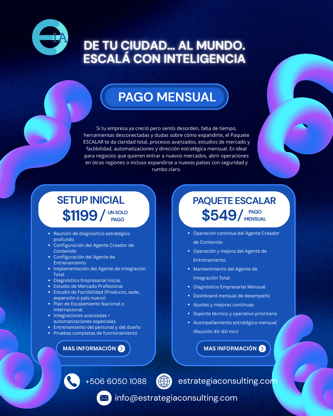 El paquete más completo: contenido profesional, entrenamiento continuo, automatización avanzada, diagnósticos estratégicos y estudios de mercado + factibilidad para escalar tu empresa a otro nivel.